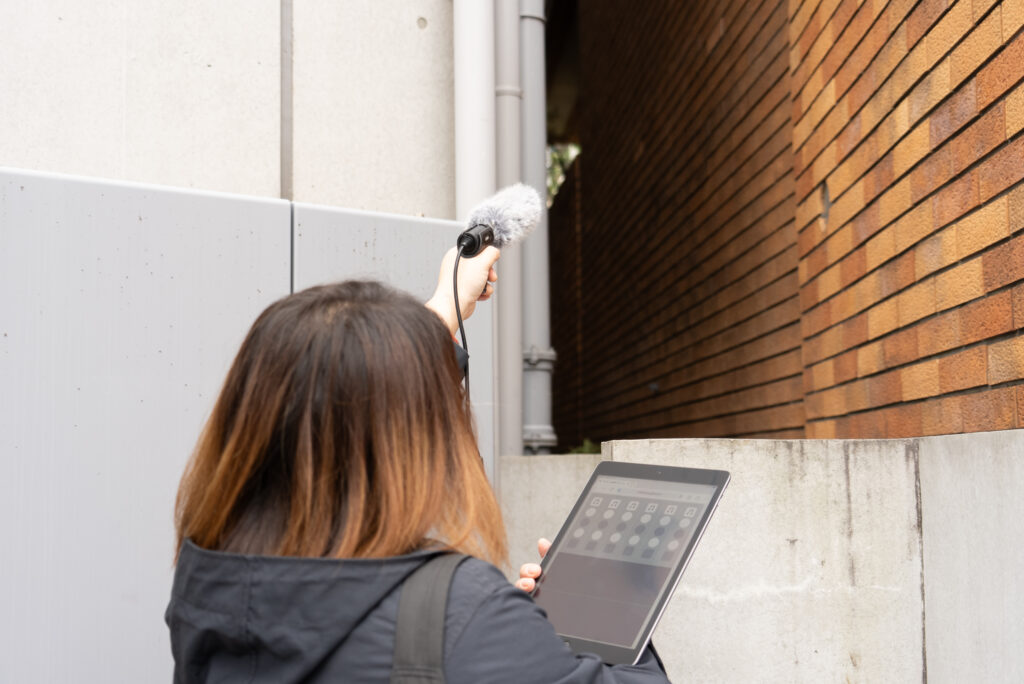 オリジナルWEBアプリ「ひらめく☆サンプラー」とマイクを手に街へ繰り出し、原宿にあふれる多彩な音を採集します。フィールド・レコーディングと呼ばれるこの手法で、目には見えない音の世界を探検します。
