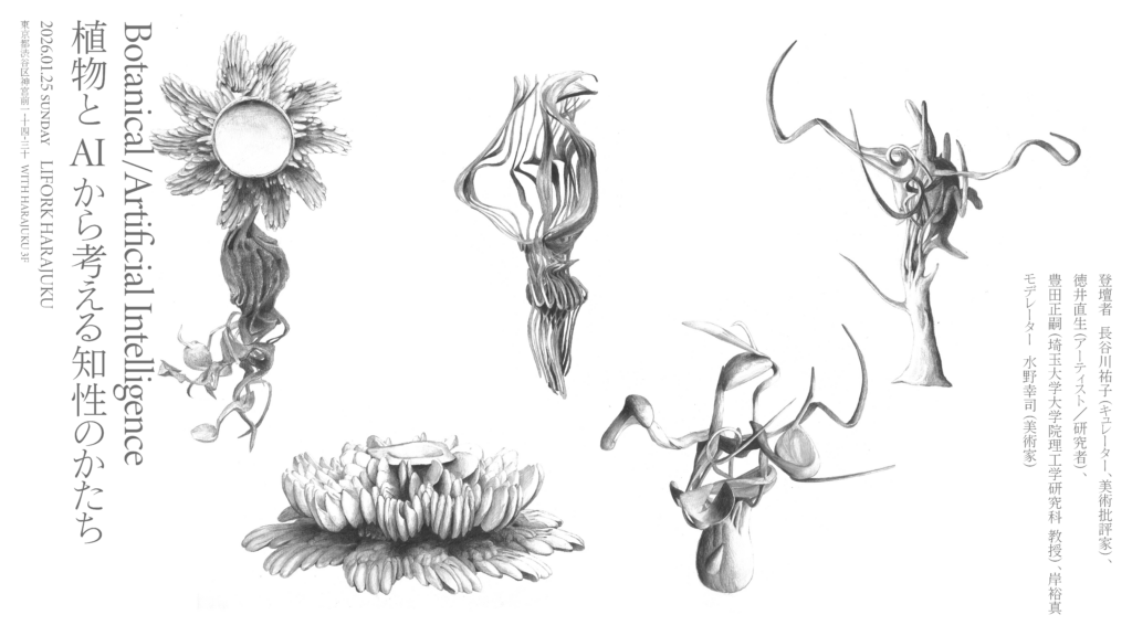 2025年度 CCBTアーティスト・フェロー 岸裕真によるプロジェクト「平行植物園」の関連イベントとして、シンポジウム「Botanical/Artificial Intelligence 植物とAIから考える知性のかたち」を開催! 2025年度CCBTアーティスト・フェローである岸裕真が取り組むプロジェクト「平行植物園」の一環として、生成AIと植物のあいだにひらかれる「知性」のかたちを考えるシンポジウムを開催します。生成AIが言葉やイメージを生み出し続け、人間の創造性のあり方が問い直されている一方で、岸は、脳を持たず、何百万年という時間をかけて環境と応答し続けてきた「植物の知性」にあらためて注目をしています。 本シンポジウムでは、「アート」「テクノロジー」「ボタニー(植物学)」の三つの領域を横断しながら、現代における「知性」の輪郭を引き直していきます。キュレーター/美術批評家の長谷川祐子氏、アーティスト/研究者の徳井直生氏、植物科学を専門とする豊田正嗣氏(埼玉大学大学院理工学研究科 教授)が登壇し、本プロジェクトの企画・制作者である岸裕真とともに、植物とAIという二つの「異種の知性」を越境して議論する場をひらきます。モデレーターは美術家の水野幸司氏が務めます。 アート・インキュベーション・プログラムを通じて岸が開発中の「BI(Botanical Intelligence)」は、植物のふるまいをインターフェースとして、未知の知性との共創や対話を実験する、アートと研究開発が交差するプラットフォームです。そこで立ち上がる「植物的なインテリジェンス」のイメージは、AIを人間中心の枠組みから解き放ち、環境全体を巻き込んだ知のあり方を構想するための仮説でもあります。本シンポジウムでは、この問いを共有しながら、「人間だけに閉じないインテリジェンス」の姿と、それを前提にした社会・都市・表現 … 続きを読む シンポジウム「Botanical/Artificial Intelligence 植物とAIから考える知性のかたち」